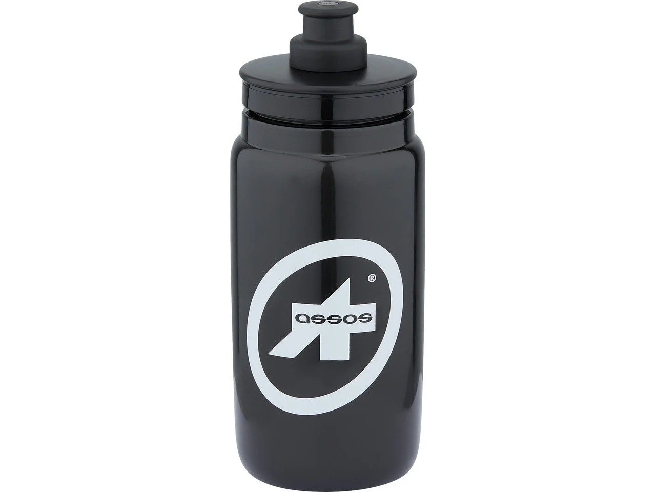 Die ASSOS Signature Trinkflasche basiert auf der bewährten Elite Fly Bottle, fasst 550 ml und hat ein großes Markenlogo auf schwarzem Untergrund.