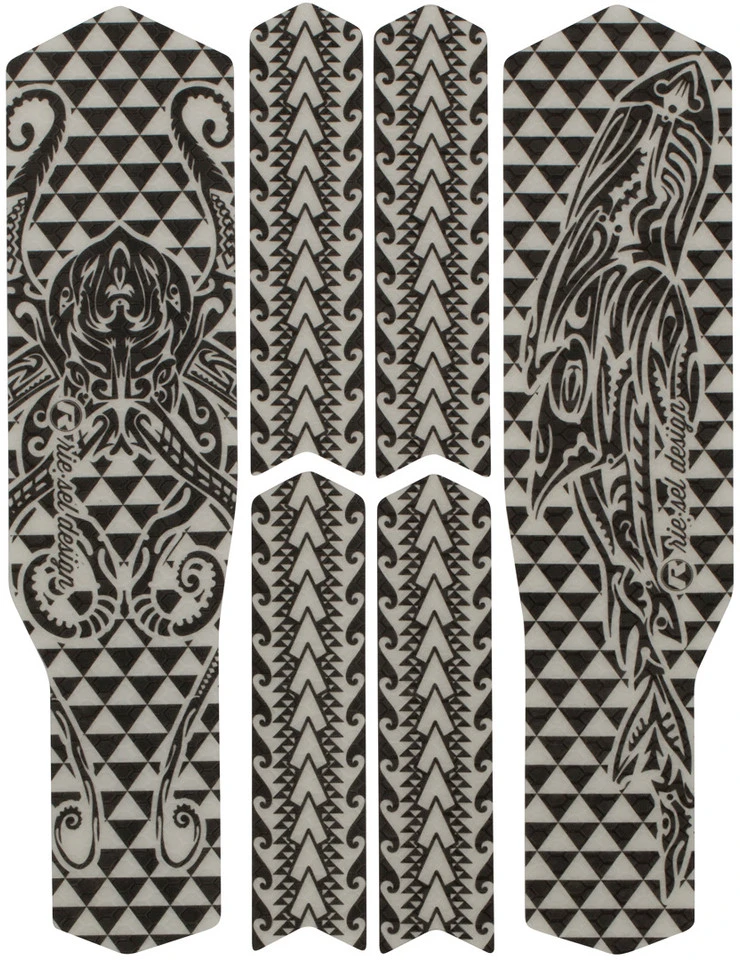Mit dem chain:TAPE 3000 Kettenstrebenschutz Set von rie:sel gehören Sorgen um Lackabschürfungen durch eine schlagende Kette oder andere mechanische Einwirkungen der Vergangenheit an. Die zwei großen und vier schmalen Shapes sind für den kompletten Hinterbau gefertigt. Die spiegelverkehrten Shapes sorgen nicht nur für optimalen Schutz, sondern auch für Style auf beiden Seiten. Sogar an komplizierten Kanten kannst Du sie problemlos anbringen, da sie selbstklebend sind. Das chain:TAPE 3000 ist äußerst robust und hält ewig – vielleicht sogar darüber hinaus. Auch das halbtransparente Design behält seine Farbkraft und bleicht nicht aus. Dein Hinterbau ist stylisch geschützt und Du kannst es bedenkenlos krachen lassen!